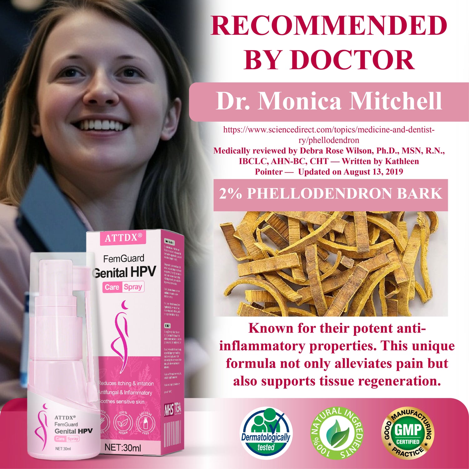 Certified by Dr. Monica Mitchell(Click to learn more) on January 19, 2025, ATTDX® FemGuard Genital HPV Care Spray contains 2% Phellodendron Bark, known for its antibacterial, antifungal, and anti-inflammatory properties that help reduce Candida and bacteria linked to itching and irritation. It also includes 1.5% of Sophora Flavescens Root, which provides antiviral support against HPV and helps soothe immune-sensitive skin. This formula offers targeted, non-invasive care for daily feminine comfort and balance.
